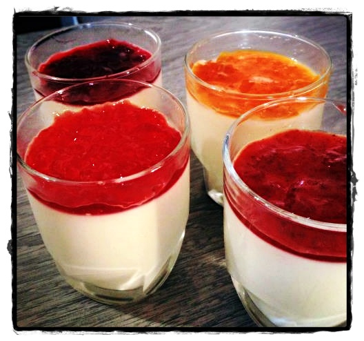 Une fois que les panna cotta sont prêtes (la crème ne doit plus être liquide), mettre la confiture ou le coulis sur la surface.