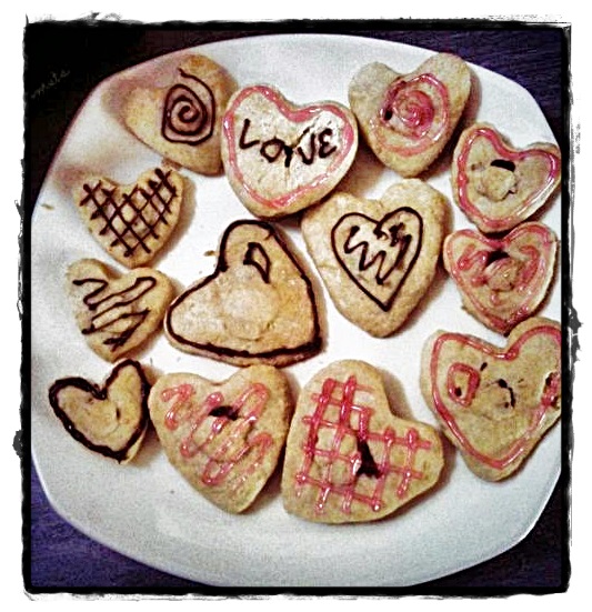 * Découper des figures avec les emporte-pièces. Les disposer dans des moules à tarte recouverts de papier sulfurisé et enfourner 9 minutes à 160°C.